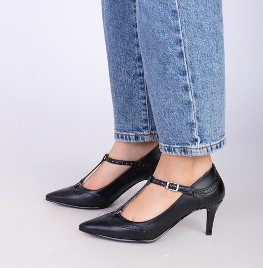 حذاء أسود بحزام على شكل حرف T مع تفاصيل بروغ وكعب بارتفاع 7 سم